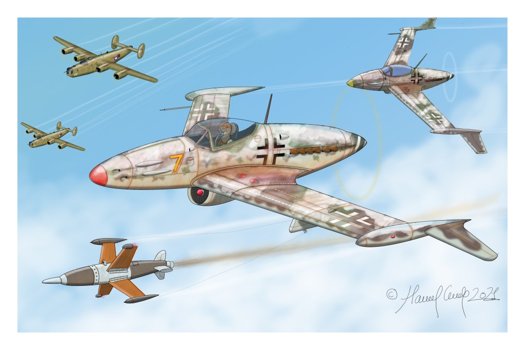 otro dibujo para el bote. Representa lo que hubiese sido el Bv 208 si se hubiera llegado a producir. Está dispando un misil filoguiado Ruhrstahl X-4. Del avion se habian construido modelos de madera que se habían probado en el tunel de viento cuando acabó la guerra.