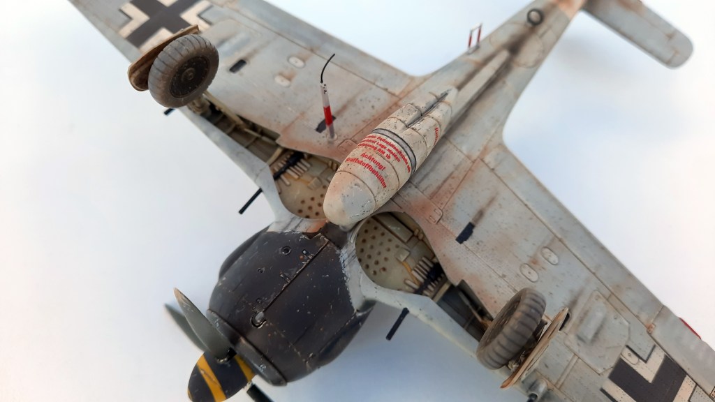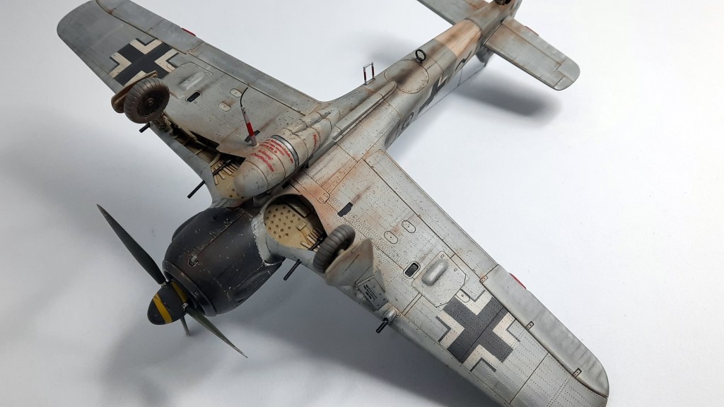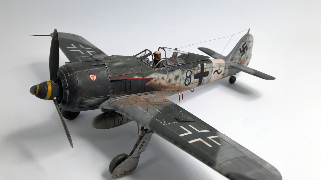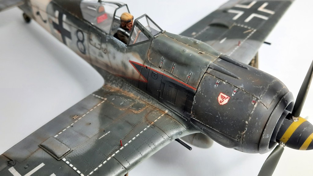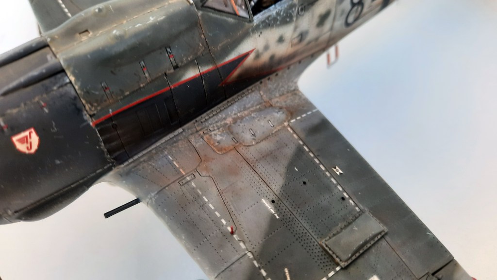 La decoración que me pidió es una de las que trae la caja, en concreto una version destinada a atacar bombarderos, a la cual se le han eliminado las ametralladoras del morro, y se le han puesto unas planchas de blindaje en los laterales de la cabina. Este avión concreto fue volado por el Unterfoffizier Willy Maximowitz desde el aeródromo de Dreux, cerca de París. El amigo Willy derribó 27 aviones durante la guerra, 15 de ellos bombarderos. Maximowitz fue dado por desaparecido el 20 de abril de 1945 sobre Seelow, en las afueras de Berlín.