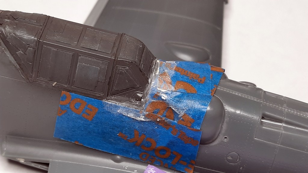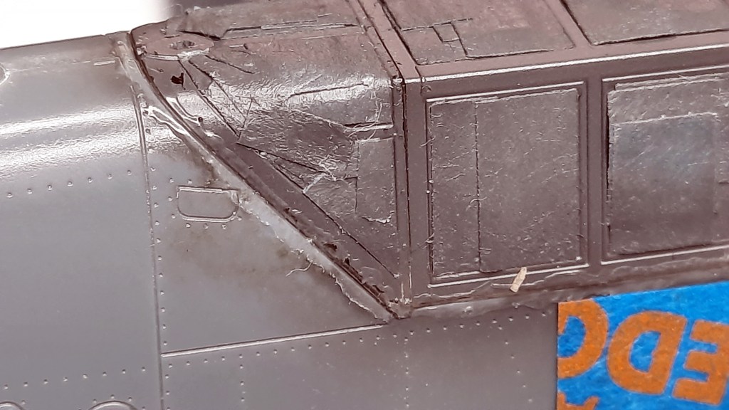 los transparentes no encajan. Vienen en tres piezas. Si empiezas a montarles de delante atrás, la tercera pieza no encaja del todo y te hace un escalón con el fuselaje. Así que he lijado la pieza delantera hasta que me encajaran las tres. Por ello el encaje ahora no es perfecto y ha necesitado masilla.