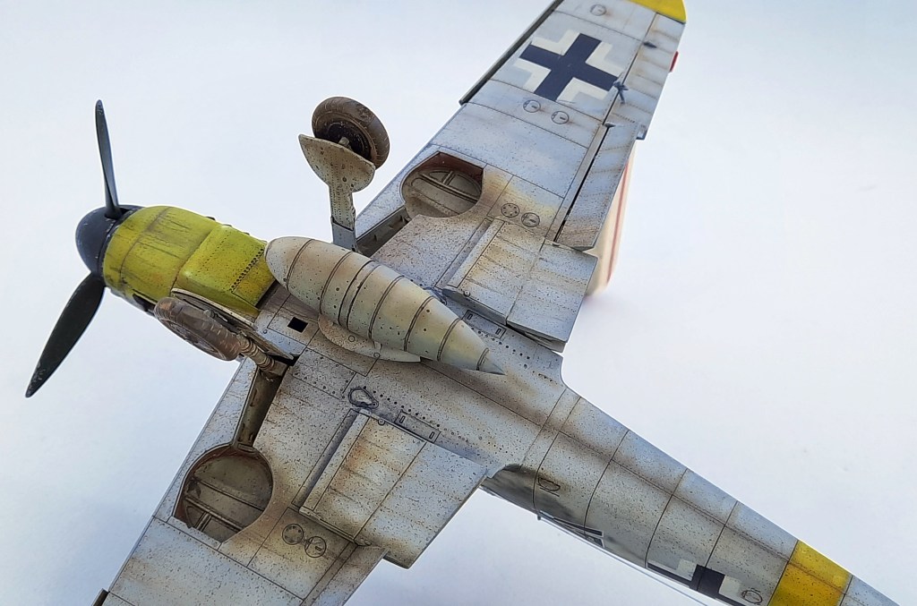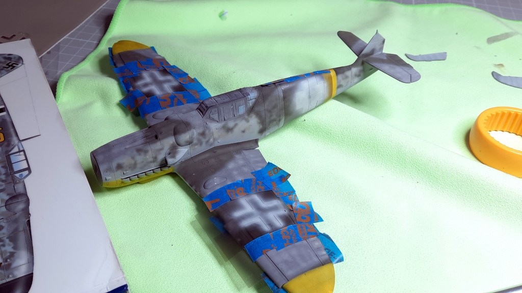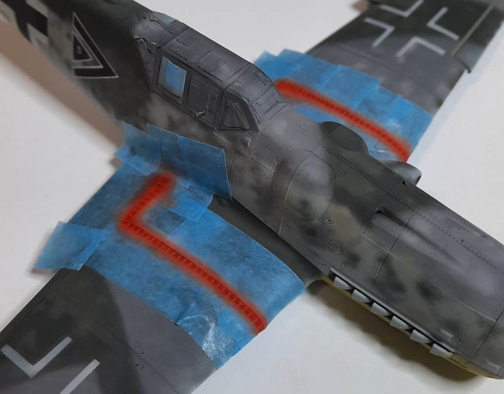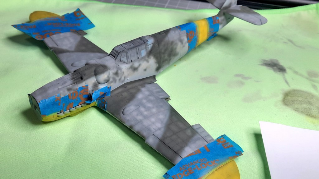 Una vez pintado los colores basicos del camuflaje, pasamos a pintar las marcas amarillas que llevaban los aviones alemanes en el Frente del Este como identificación. El papel de enmascarar es de baja adherencia comprado en una ferretería. Los destastes de los colores base se han exagerado porque luego el proceso de enguarre tiende a igualarlo todo. Éste es un tema difícil de cuantificar en el que si nos pasamos arruinamos el trabajo final.