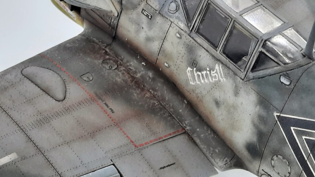 Aquí ya están todas las marcas. He utilizado los triangulos de combustible y algunos letreros de ¨no pisar¨ de la caja de sobras, pero la mayoría de los stencils están pintados a pincel. El numero 5 sobre el triangulo negro y el cartel de Christl están hechos a pincel a mano alzada. El truco está en marcar el sitio con papel de enmarcarar para que te sirva de guía.