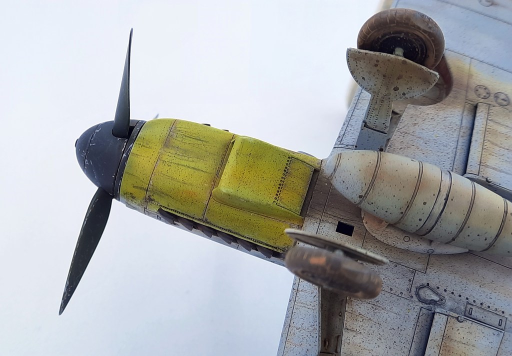 Las portezuelas de los radiadores pintadas en enguarrinadas. No me suele gustar poner cosas abiertas en mi aviones, pero quiero que este sea un proyecto rápido y he tenido muy malas experiencias intentando cerrar lo que Eduard prefiere abierto.