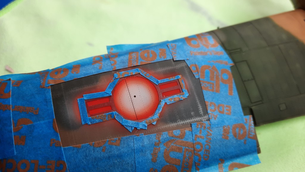 A continuación pinto en rojo la zona que va a quedar rojo, y voy a cubrir la zona que quedará en rojo con la máscara correspondiente