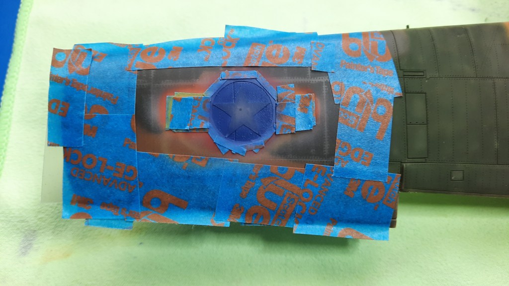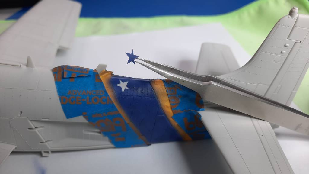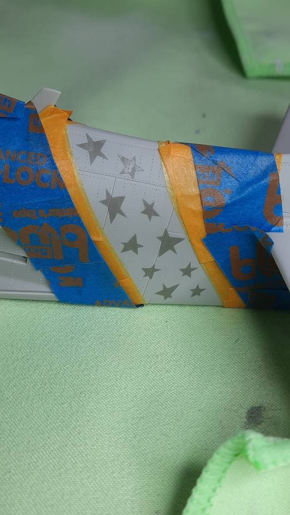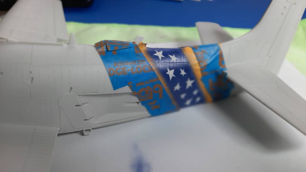Ahora toca enmascarar totalmente la franja con las estrellas y lo que va a quedar en blanco, y pintar el resto del avión. Todo a mano alzada